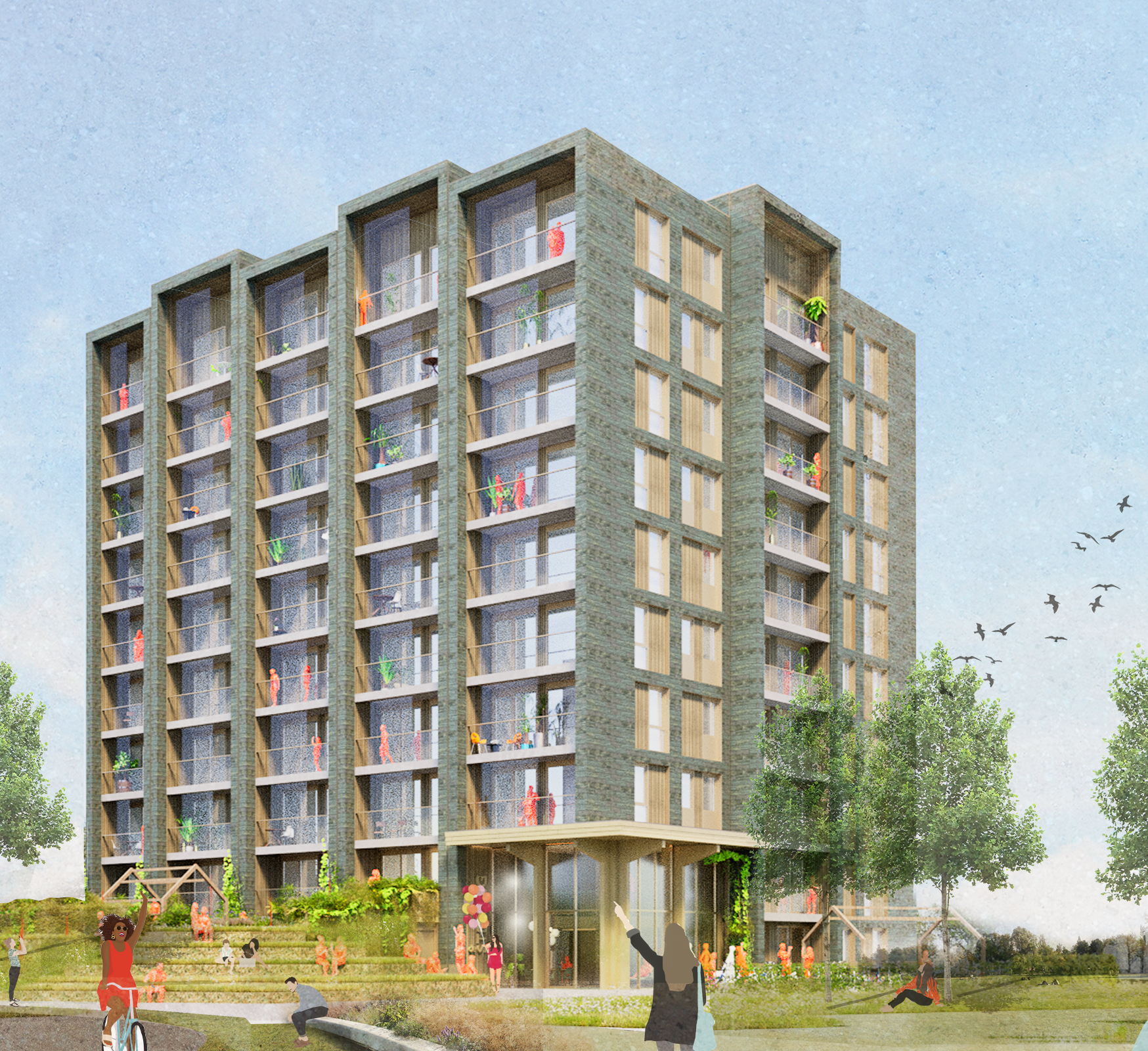 Meerdere generaties vinden hier hun plek. Er komen woningen voor ouderen uit de buurt om de doorstroom in de wijk te bevorderen. Er is genoeg ruimte voor een praatje op de dakterrassen of in de binnentuin. De zigzaggende vorm van de galerijen en speelse loopbruggen nodigen uit om het hoekje om te kijken of een stukje verder te lopen. Ook zijn ze breed opgezet zodat je hier ook voor je deur kunt zitten.